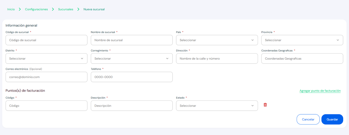 5. Ingresa los datos del primer punto de facturación que se ubicará dentro de la sucursal