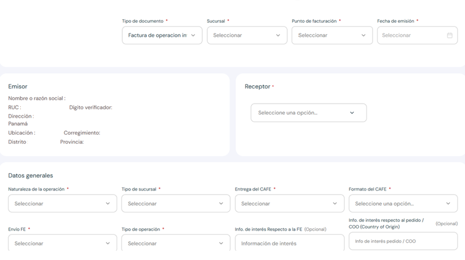 Nota importante: los campos con un * Rojo son mandatorios, por lo que debe llevar información para que el documento sea emitido correctamente.